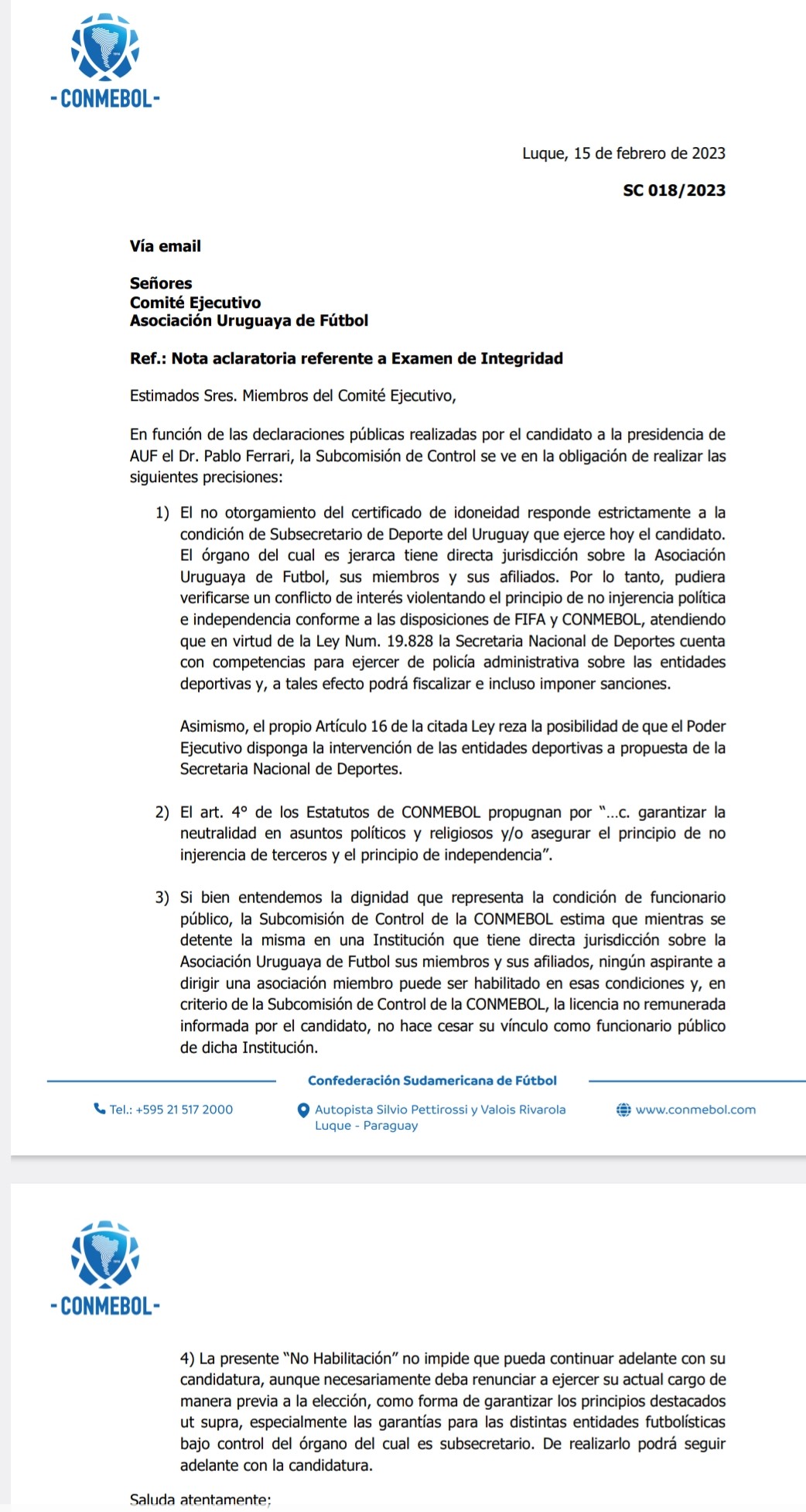 El candidato opositor de Ignacio Alonso, Pablo Ferrari fue notificado por Conmebol en una carta que no validaban su certificado de idoneidad por ser parte de un organismo público (Secretaría Nacional del Deporte) y le exigían que renunciara para poder ser candidato a la AUF.