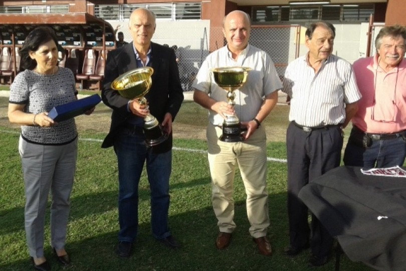Foto: Cónsul general del Uruguay Lilian Alfaro, El intendente de Lanus Néstor Grindetti y el presidente de esta institución Nicolás Russo para entregar los trofeos en juego y un reconocimiento a Eduardo Curia.