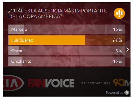 Según una encuesta que viene realizando el portal español 90min.com, Luis Suárez es la ausencia más importante de la Copa América.